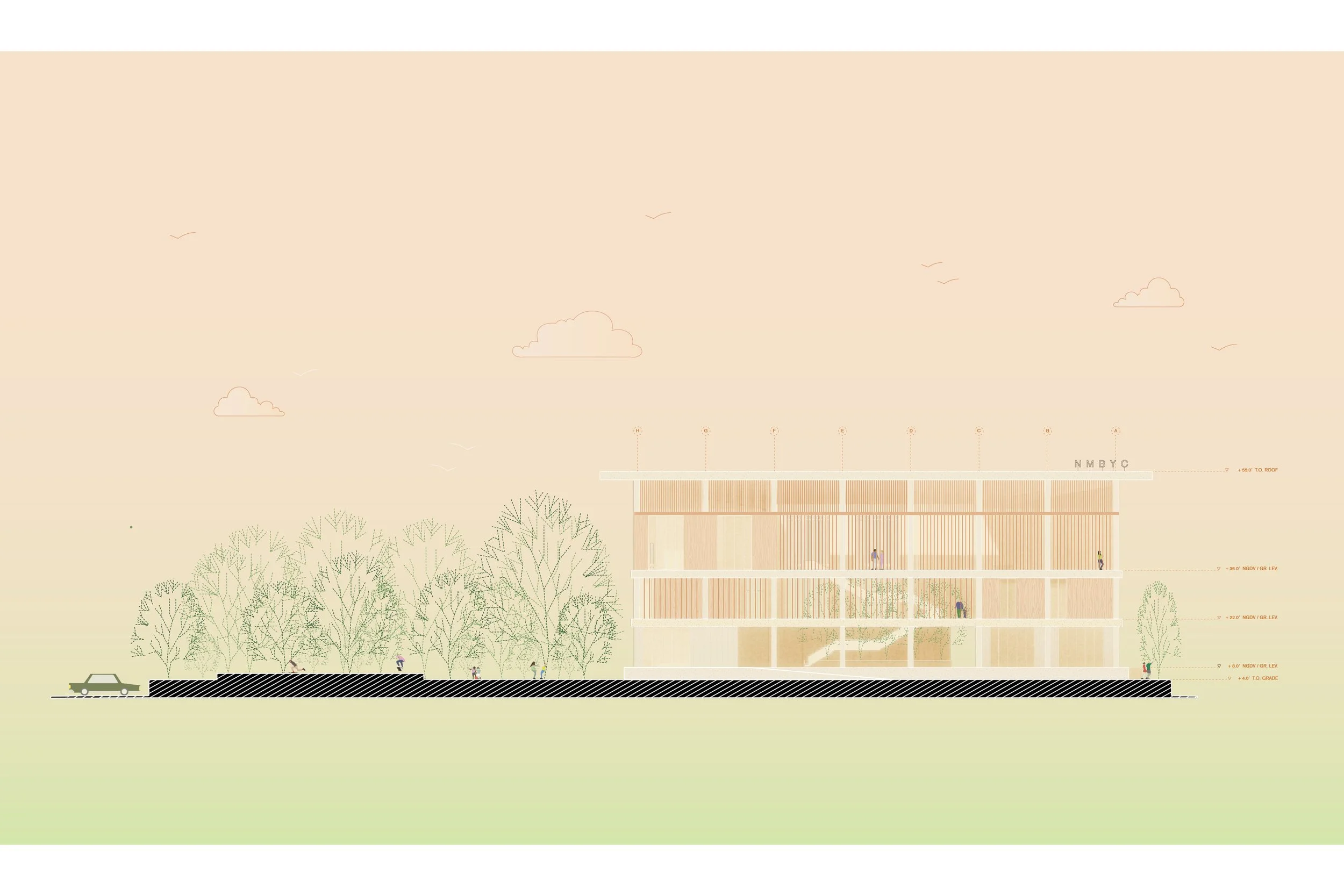 Inspired by the site’s centralized banyan tree, the design features a hypostyle hall with open-air terrace spaces and stacked program blocks, utilizing both concrete and wood elements which blend with South Florida's tropical context. The ground floor accommodates high-traffic programs like a juice bar and skate shop, while the second floor includes a gymnasium and exercise rooms. Classrooms and a table tennis area overlook the gym on the third floor. The building design exercises an engagement of resiliency in response to the growing environmental conditions of climate change and sea-level rise. The majority of the NMBYC can function without air-conditioning through utilization of the strong winds coming from the Atlantic Ocean from the east. The entire building is raised four feet above grade to withstand flooding and sea-level rise. Constructed of concrete and wood, the project’s goal is to reference tropical principles while staying true to South Florida concrete construction.