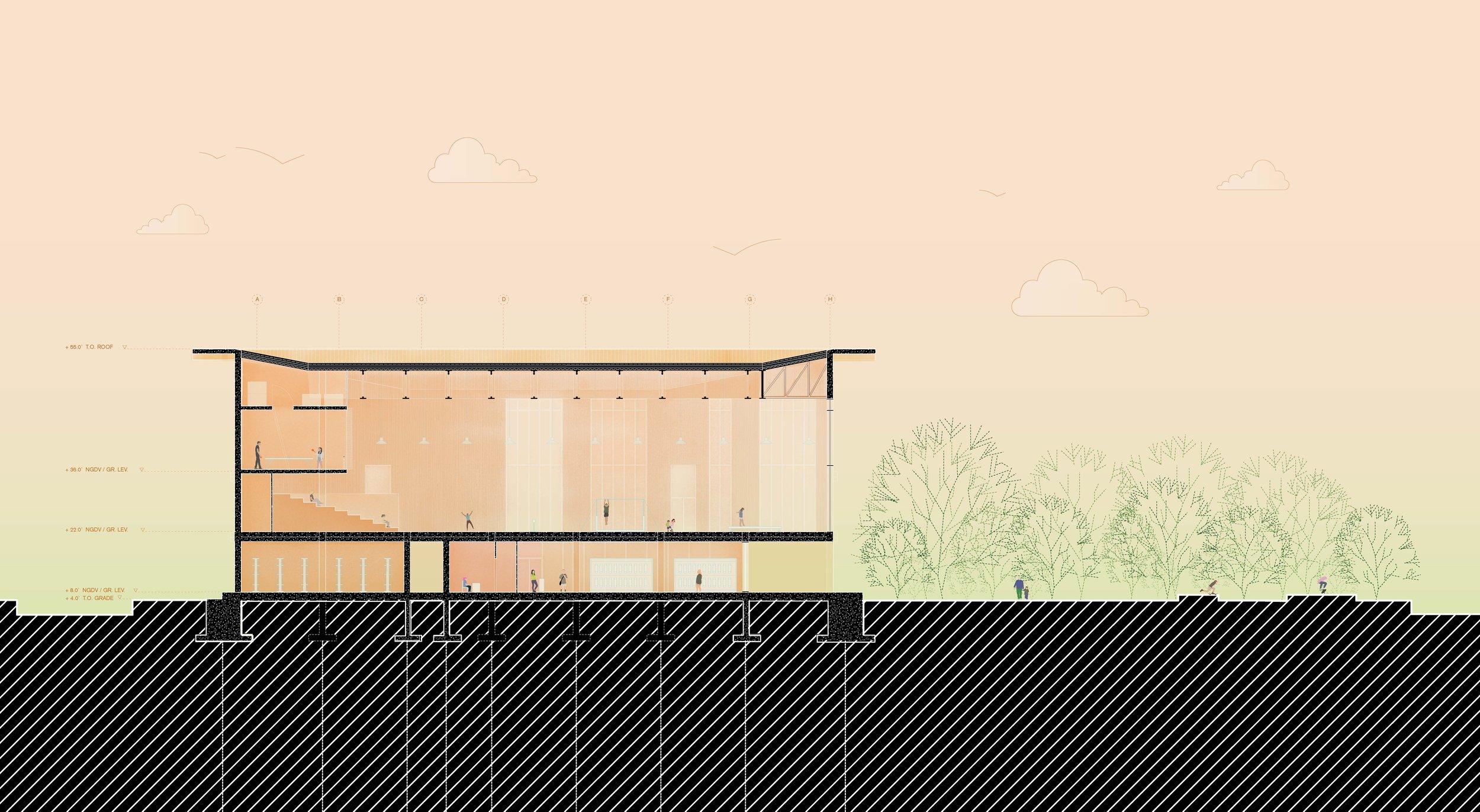 The North Miami Beach Youth Center (NMBYC) is located on Collins Avenue, directly across from Oceanside Park. The lot currently houses a small skate park that predominantly draws school-aged athletes. Therefore, the NMBYC proposes a large public recreational building dedicated to the young population of the area. Existing activity levels on the site strongly suggest that the program could be a catalyst of a transformation for the neighborhood.